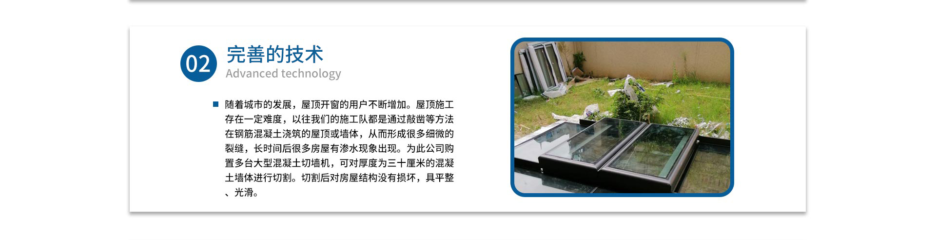 奉獻給客戶的不僅是一種產品,更是一種家居理念,一種生活文化。隨著城市的發展,屋頂開窗的用戶不斷增加。屋頂施工存在一定難度,以往我們的施工隊都是通過敲鑿等方法在鋼筋混凝土澆筑的屋頂或墻體,從而形成很多細微的裂縫,長時間后很多房屋有滲水現象出現。為此公司購置多臺大型混凝土切墻機,可對厚度為三十厘米的混凝土墻體進行切割。切割后對房屋結構沒有損壞,具平整、光滑。也是天窗開洞口,混凝土墻體開門洞,開樓梯洞等等的好選擇。另外提供天窗維修業務。